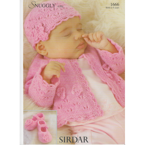 This 4 ply knitting pattern contains instructions for a cardigan, hat and shoessizes 0-3 months to 5..